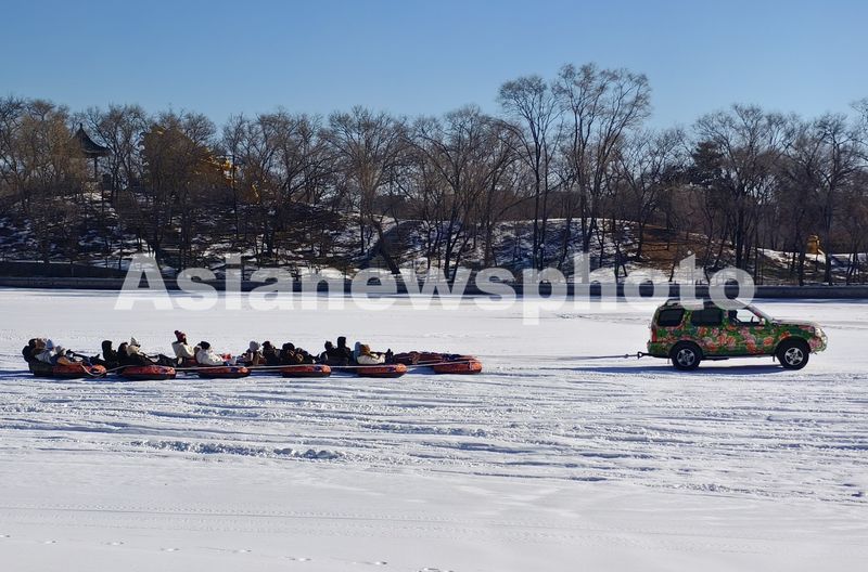 2025年12月29日,辽宁沈阳,游客在白雪皑皑的冰湖内感受冰雪运动带来的快乐。