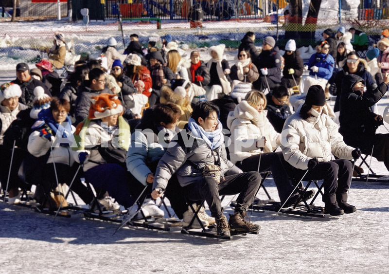 2025年12月29日,辽宁沈阳,游客在白雪皑皑的冰湖内感受冰雪运动带来的快乐。