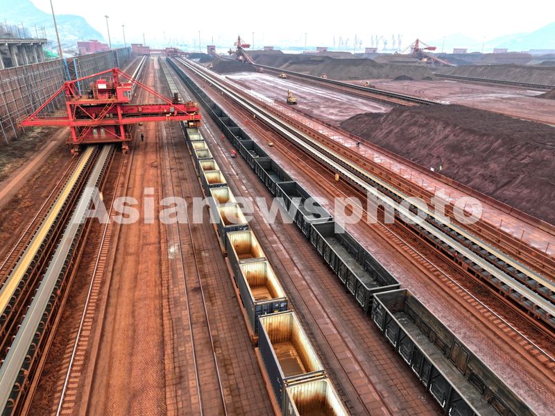 2026年1月4日,在江苏省连云港港新苏港码头,大型机械正往列车运送铁矿石。
