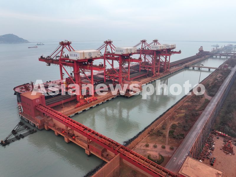 2025年1月3日晚,满载约40万吨铁矿石的香港籍“广州矿石”轮停靠江苏省连云港港新苏港码头卸载铁矿石。该轮长361.9米、宽65米,最大吃水22.29米,铁矿石是从巴西装船出发,经过40多天航行抵达目的地连云港。