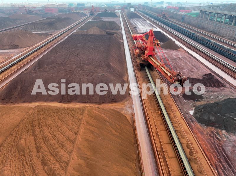 2026年1月4日,在江苏省连云港港新苏港码头,大型机械正在货场堆放储存铁矿石。