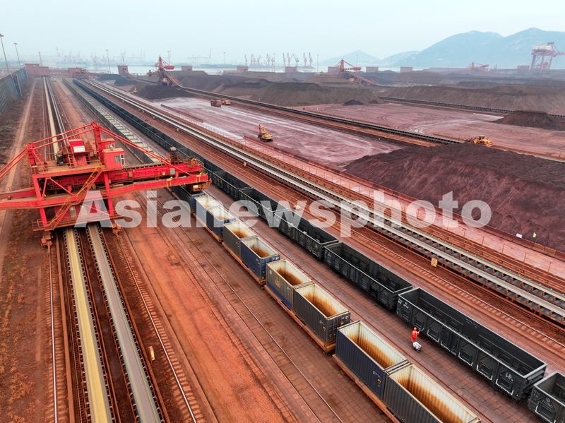 2026年1月4日,在江苏省连云港港新苏港码头,大型机械正往列车运送铁矿石。