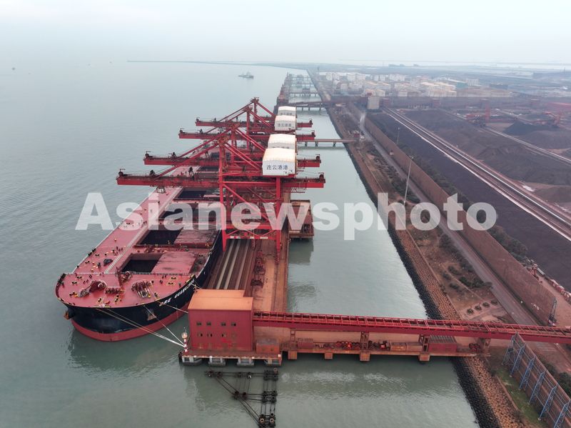 2025年1月3日晚,满载约40万吨铁矿石的香港籍“广州矿石”轮停靠江苏省连云港港新苏港码头卸载铁矿石。该轮长361.9米、宽65米,最大吃水22.29米,铁矿石是从巴西装船出发,经过40多天航行抵达目的地连云港。