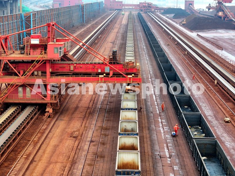 2026年1月4日,在江苏省连云港港新苏港码头,大型机械正往列车运送铁矿石。