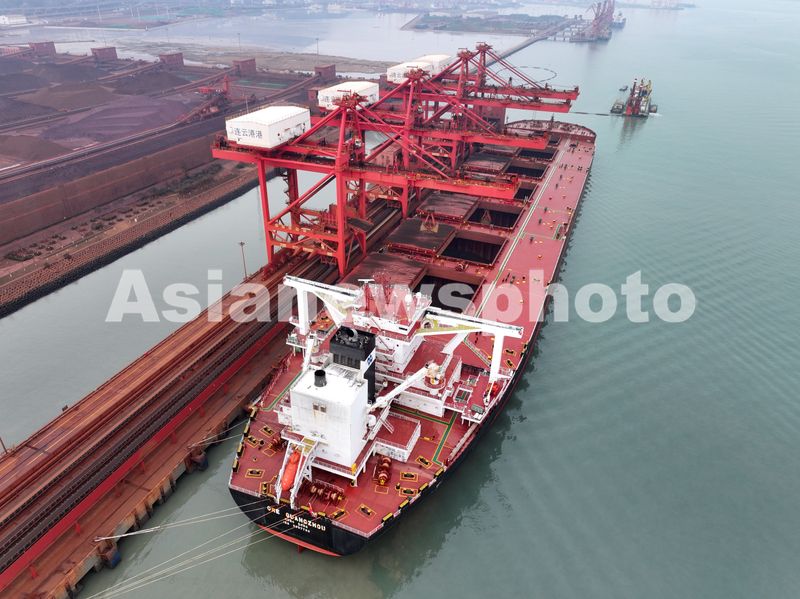 2025年1月3日晚,满载约40万吨铁矿石的香港籍“广州矿石”轮停靠江苏省连云港港新苏港码头卸载铁矿石。该轮长361.9米、宽65米,最大吃水22.29米,铁矿石是从巴西装船出发,经过40多天航行抵达目的地连云港。