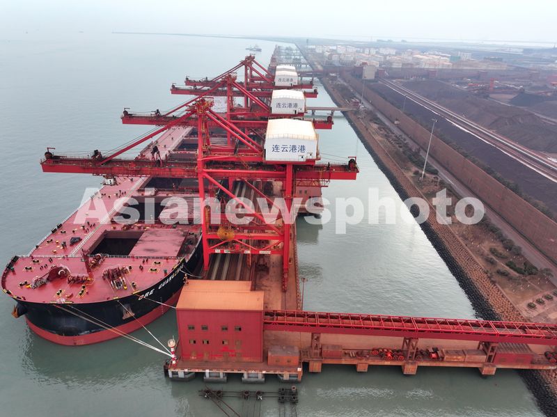2025年1月3日晚,满载约40万吨铁矿石的香港籍“广州矿石”轮停靠江苏省连云港港新苏港码头卸载铁矿石。该轮长361.9米、宽65米,最大吃水22.29米,铁矿石是从巴西装船出发,经过40多天航行抵达目的地连云港。