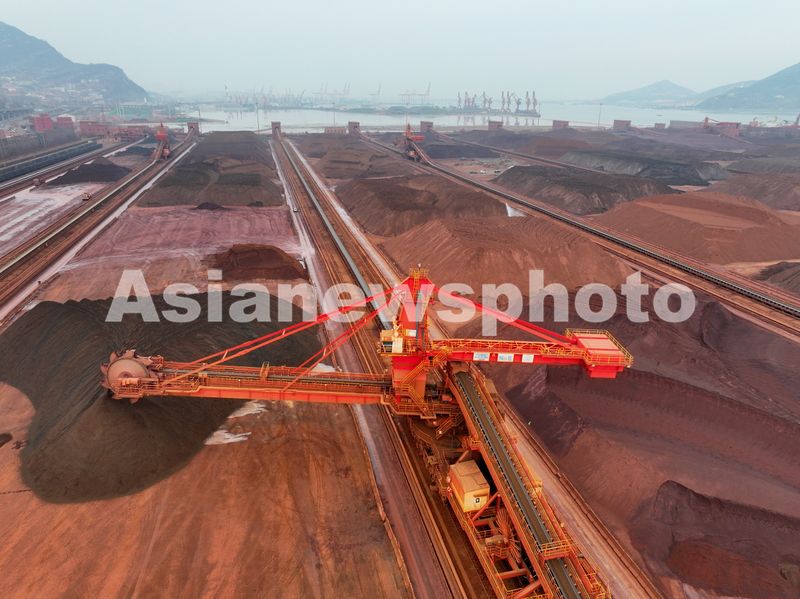 2026年1月4日,在江苏省连云港港新苏港码头,大型机械正在货场堆放储存铁矿石。