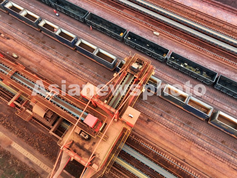 2026年1月4日,在江苏省连云港港新苏港码头,大型机械正往列车运送铁矿石。