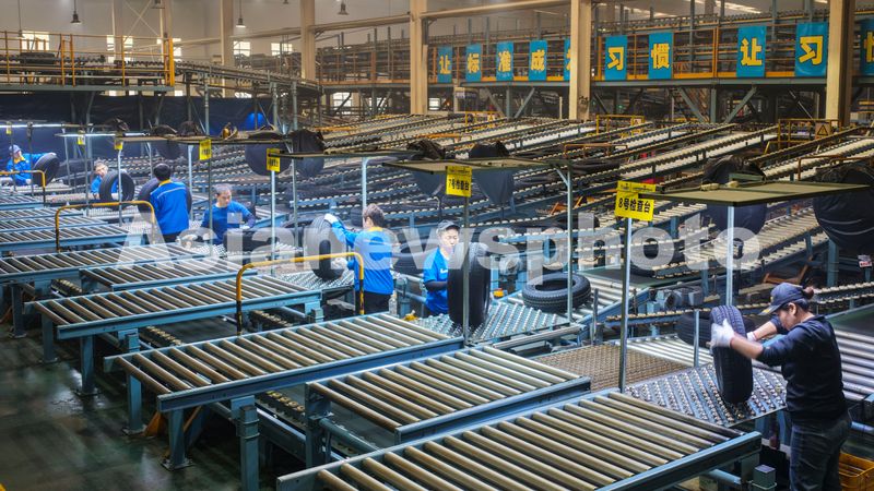 2026年1月4日,在山东省东营市广饶县大王镇的一家橡胶轮胎企业,工人们正在对出口橡胶轮胎产品进行外观检查。