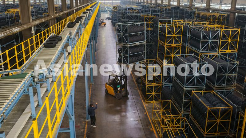 2026年1月4日,在山东省东营市广饶县大王镇的一家橡胶轮胎企业,工人们正在装运出口轮胎产品。