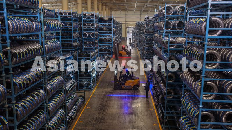 2026年1月4日,在山东省东营市广饶县大王镇的一家橡胶轮胎企业,工人们正在装运出口轮胎产品。
