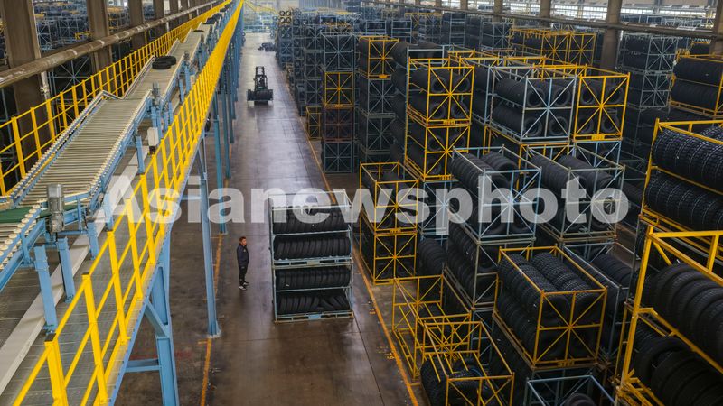 2026年1月4日,在山东省东营市广饶县大王镇的一家橡胶轮胎企业,工人们正在装运出口轮胎产品。