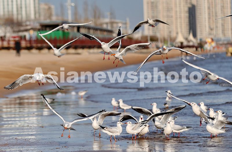 2026年1月6日,河北省秦皇岛市海港区金梦海湾海滩,海鸥正在觅食。