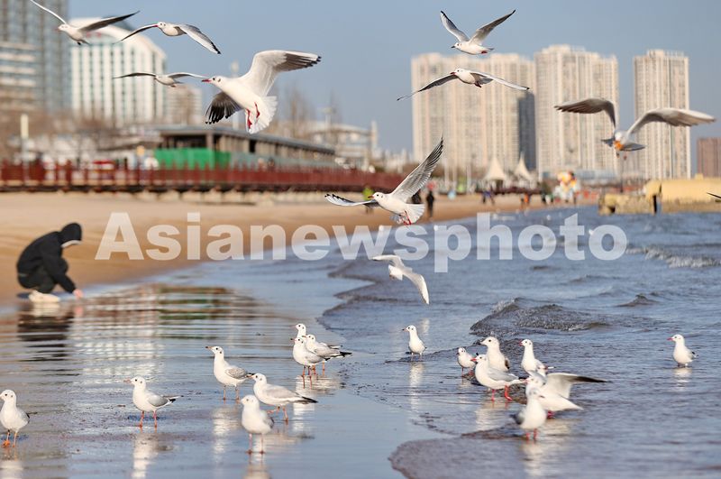 2026年1月6日,河北省秦皇岛市海港区金梦海湾海滩,海鸥正在觅食。