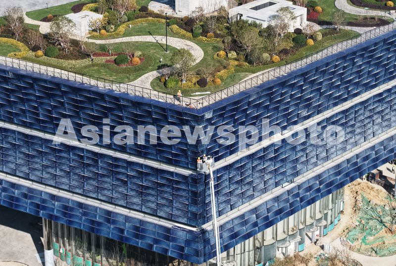 2026年1月7日,工人对中国京杭大运河博物院外立面蓝色琉璃幕墙铺设进行固定作业。