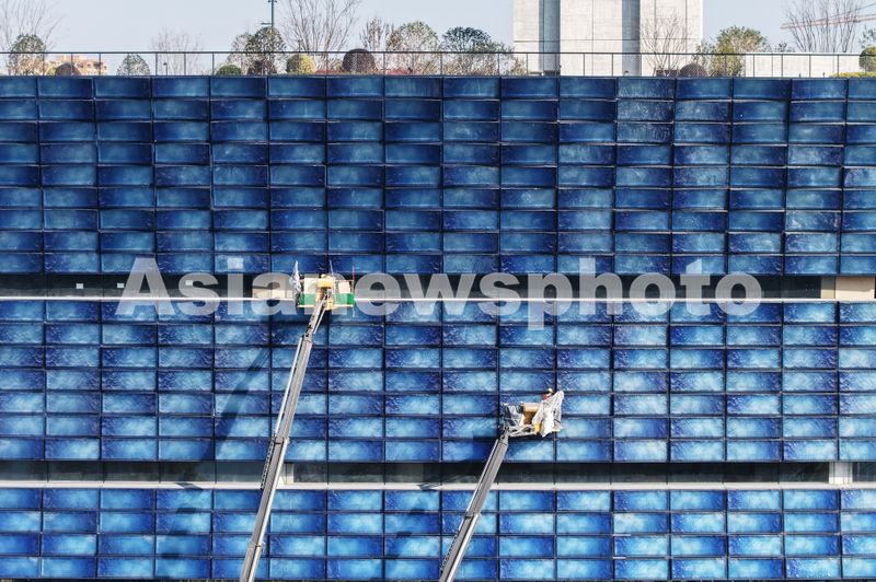 2026年1月7日,工人对中国京杭大运河博物院外立面蓝色琉璃幕墙铺设进行固定作业。
