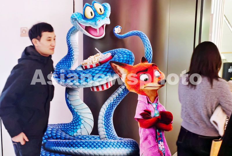 图片说明:2026年1月5日,上海电影院,影迷经过迪士尼动画电影《疯狂动物城2》的卡通人形立板。