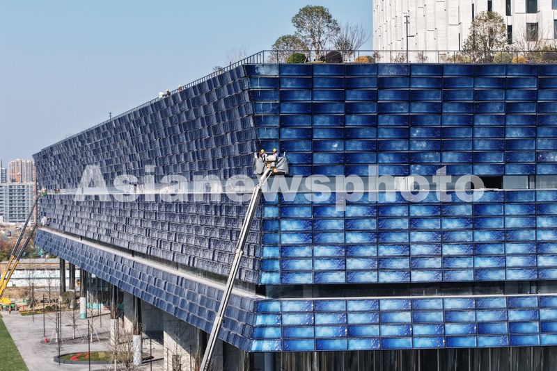 近日,位于杭州的中国京杭大运河博物院外立面蓝色琉璃幕墙铺设基本完工,工人利用晴好天气抓紧时间对蓝色琉璃幕墙进行最后固定作业。