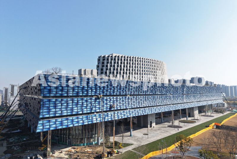 近日,位于杭州的中国京杭大运河博物院外立面蓝色琉璃幕墙铺设基本完工,工人利用晴好天气抓紧时间对蓝色琉璃幕墙进行最后固定作业。