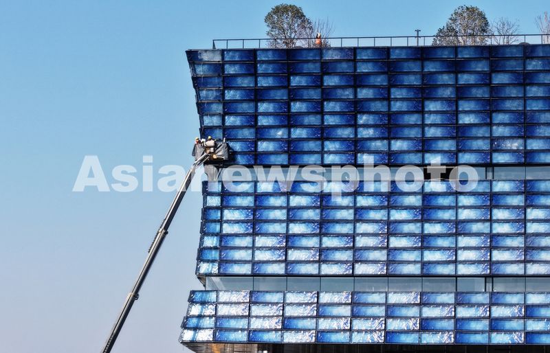 近日,位于杭州的中国京杭大运河博物院外立面蓝色琉璃幕墙铺设基本完工,工人利用晴好天气抓紧时间对蓝色琉璃幕墙进行最后固定作业。