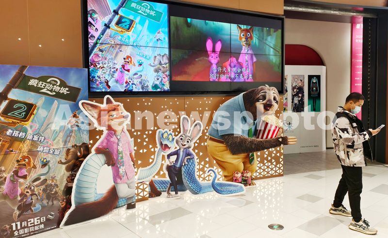 图片说明:2026年1月5日,上海电影院,影迷经过迪士尼动画电影《疯狂动物城2》的宣传片和卡通人形立板。