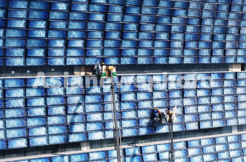 2026年1月7日,工人对中国京杭大运河博物院外立面蓝色琉璃幕墙铺设进行固定作业。