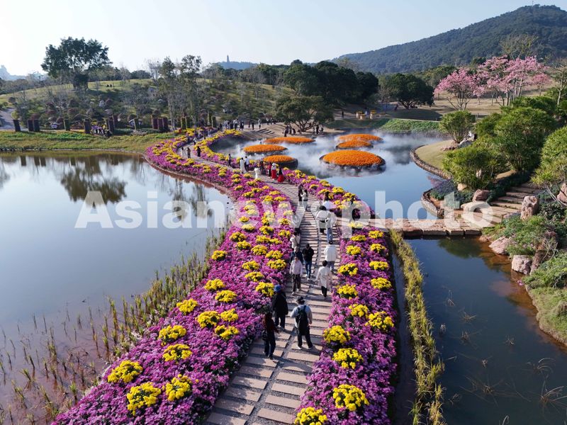 广西壮族自治区南宁市青秀山风景区丘石花园内的菊花、美丽异木棉等花海迎来盛花期。满目的缤纷花海令人沉醉,吸引不少市民和游人穿梭于花海间赏花游玩,或在这片迷人花海中拍照留念,感受绿城南宁的多彩冬日,十分热闹。