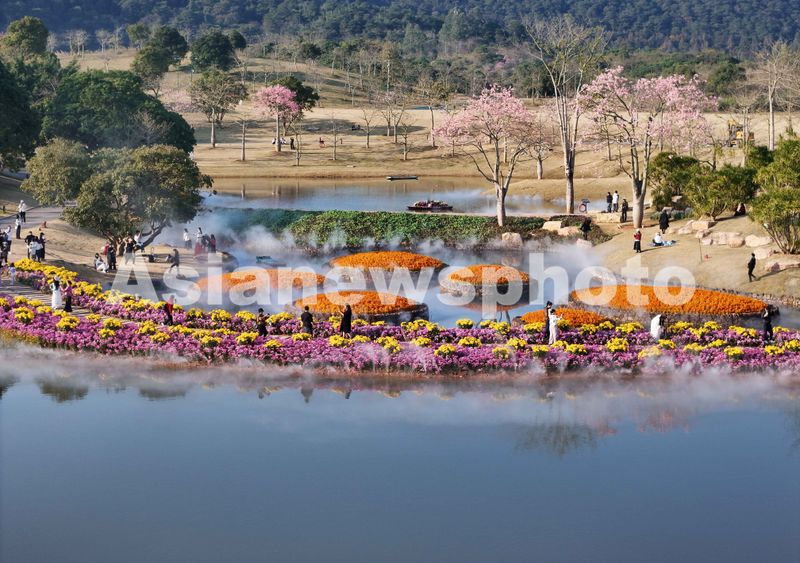 广西壮族自治区南宁市青秀山风景区丘石花园内的菊花、美丽异木棉等花海迎来盛花期。满目的缤纷花海令人沉醉,吸引不少市民和游人穿梭于花海间赏花游玩,或在这片迷人花海中拍照留念,感受绿城南宁的多彩冬日,十分热闹。