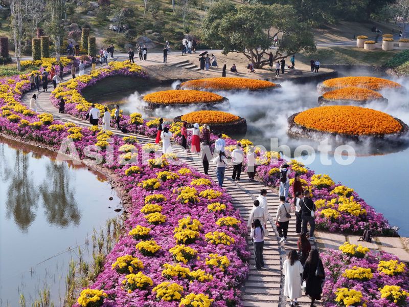 广西壮族自治区南宁市青秀山风景区丘石花园内的菊花、美丽异木棉等花海迎来盛花期。满目的缤纷花海令人沉醉,吸引不少市民和游人穿梭于花海间赏花游玩,或在这片迷人花海中拍照留念,感受绿城南宁的多彩冬日,十分热闹。