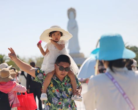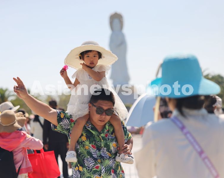 2026年1月9日,海南三亚,家长带着孩子在三亚南山文化旅游区游览。