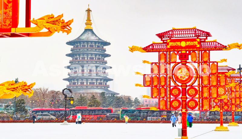 2026年1月19日,洛阳喜降瑞雪。朱樱塔、应天门、天堂明堂、洛邑古城、大运河博物馆等景点银装素裹。