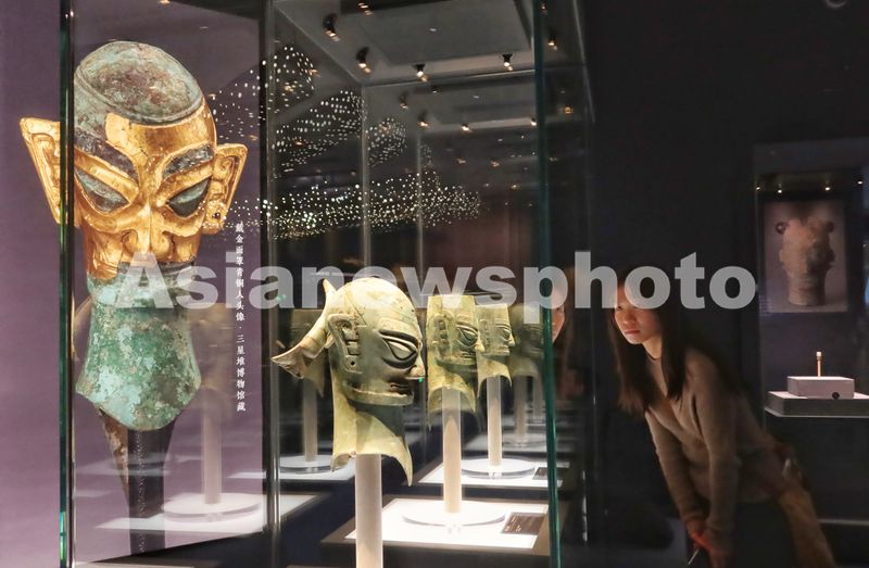 1月18日,观众参观展出的青铜人头像。