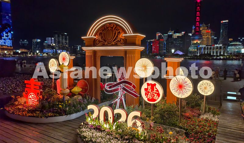 图片说明:2026年1月28日,上海,外滩滨江旅游风景区近日上新一组新春石库门艺术景观装置,与陆家嘴的东方明珠和繁华高楼灯光秀“同框”组成都市新年璀璨夜景。