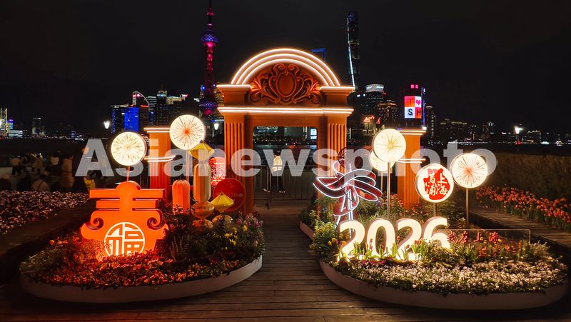 图片说明:2026年1月28日,上海,外滩滨江旅游风景区近日上新一组新春石库门艺术景观装置,与陆家嘴的东方明珠和繁华高楼灯光秀“同框”组成都市新年璀璨夜景。