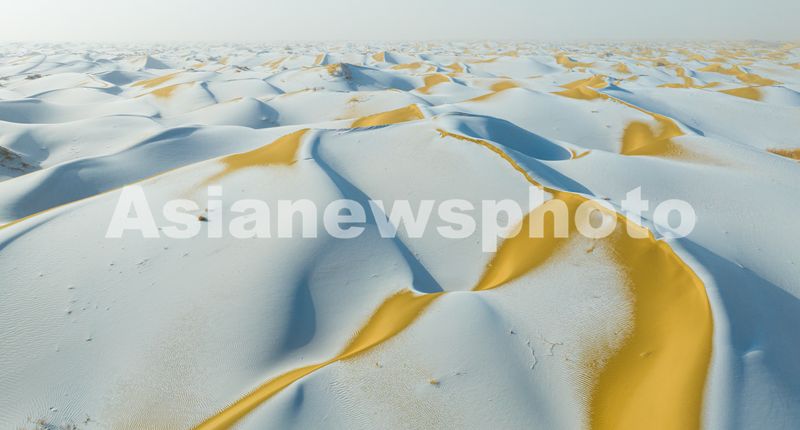 2026年1月29日,新疆巴音郭楞蒙古自治州尉犁县塔克拉玛干沙漠边缘迎来降雪天气,沙漠在皑皑白雪的映衬下,唯美壮观。