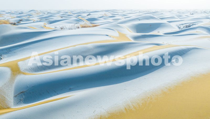 2026年1月29日,新疆巴音郭楞蒙古自治州尉犁县塔克拉玛干沙漠边缘迎来降雪天气,沙漠在皑皑白雪的映衬下,唯美壮观。