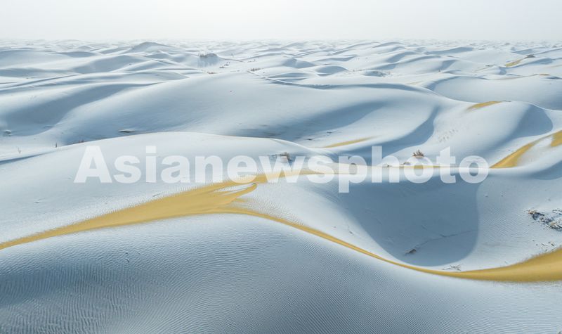 2026年1月29日,新疆巴音郭楞蒙古自治州尉犁县塔克拉玛干沙漠边缘迎来降雪天气,沙漠在皑皑白雪的映衬下,唯美壮观。