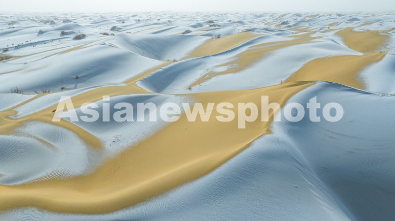 2026年1月29日,新疆巴音郭楞蒙古自治州尉犁县塔克拉玛干沙漠边缘迎来降雪天气,沙漠在皑皑白雪的映衬下,唯美壮观。