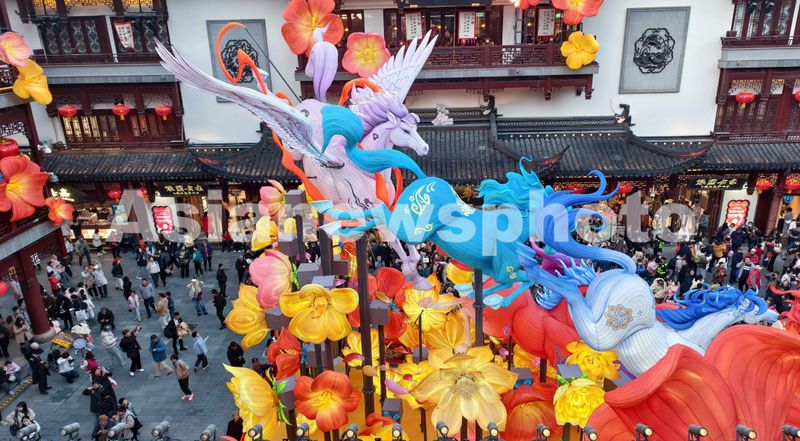 2026年2月4日,上海,豫园马年春节艺术灯会人气红火,华宝楼中心广场以“盛唐六骏”为灵感的骏马飞天非遗彩灯吸引游客。