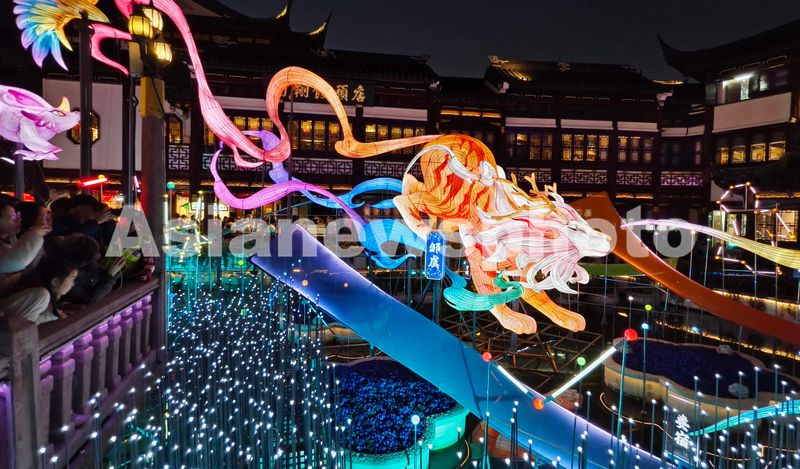 2026年2月4日,上海,豫园马年春节艺术灯会从神话《山海经》汲取灵感打造璀璨夜景,九曲桥畔的神兽“驺虞”非遗彩灯吸引游客。