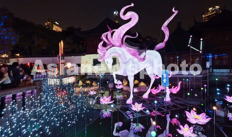 2026年2月4日,上海,豫园马年春节艺术灯会从神话《山海经》汲取灵感打造璀璨夜景,九曲桥畔的神兽“吉量”非遗彩灯吸引游客。