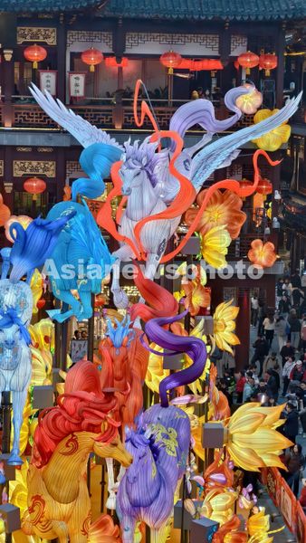 2026年2月4日,上海,豫园马年春节艺术灯会打造璀璨夜景,华宝楼中心广场以“盛唐六骏”为灵感的骏马飞天非遗彩灯吸引游客。