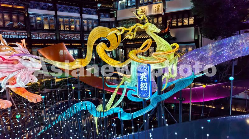 2026年2月4日,上海,豫园马年春节艺术灯会从神话《山海经》汲取灵感打造璀璨夜景,九曲桥畔的神兽“英招”非遗彩灯吸引游客。