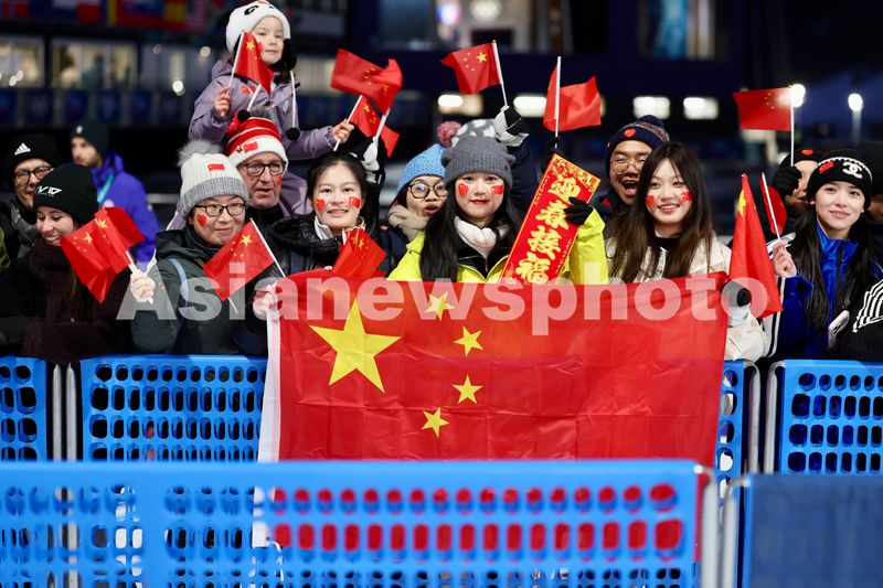 2月7日,观众为中国选手苏翊鸣加油鼓劲。