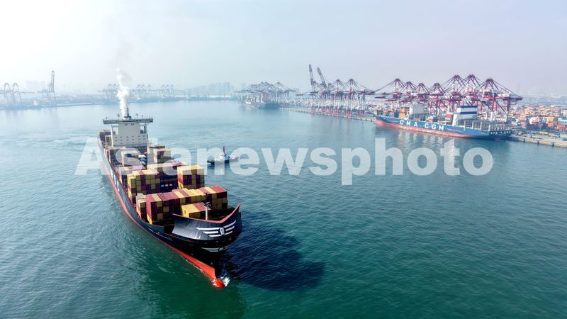 2026年2月13日,山东港口青岛港,装载外贸集装箱的货轮驶离港口。
