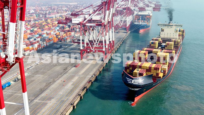 2026年2月13日,春节期间,山东港口青岛港港口工人坚守岗位,装载外贸集装箱的货轮进出不断,运送集装箱的车辆川流不息,货物贸易一派繁忙。