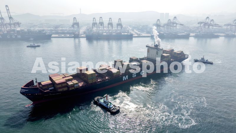2026年2月13日,山东港口青岛港,装载外贸集装箱的货轮在调整航向。
