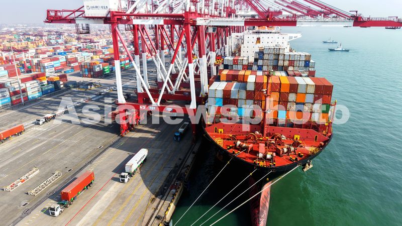 2026年2月13日,山东港口青岛港,货轮在装卸外贸集装箱。
