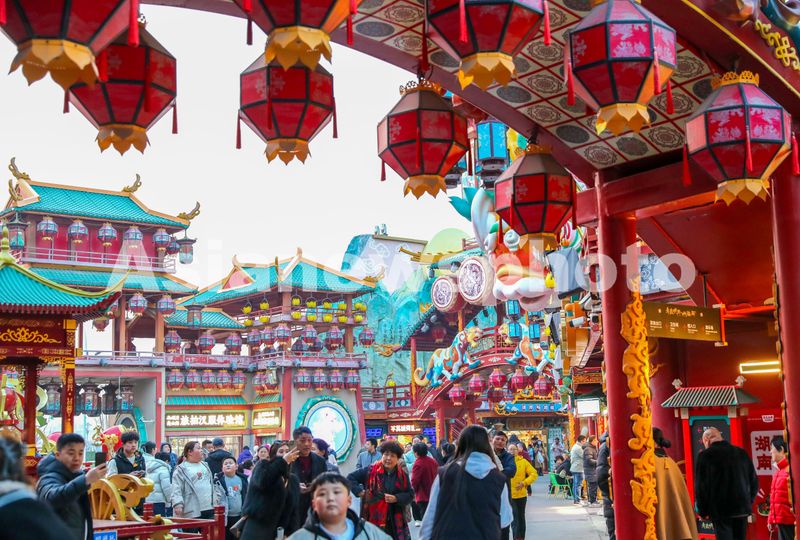 图片说明:2月19日晚,游客在位于青岛市城阳区的明月·山海间不夜城主题街区游玩。