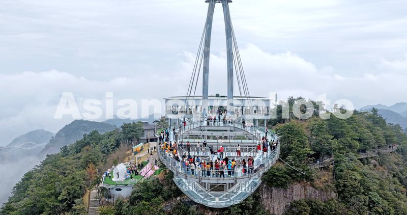 图片说明:2026年3月8日,游客在浙江省台州市仙居县神仙居景区南天顶玻璃观景台上游玩。